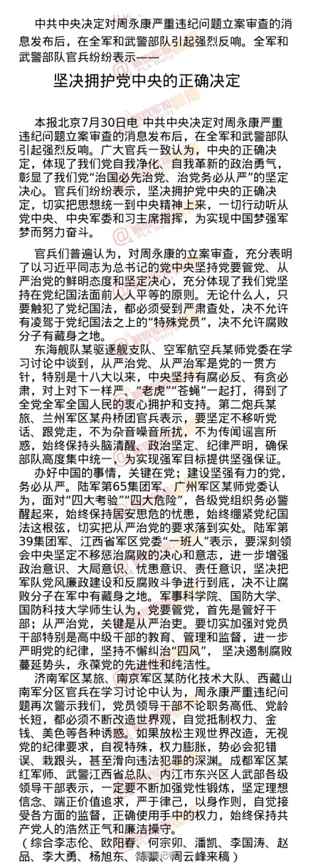 全軍和武警部隊(duì):堅(jiān)決擁護(hù)中央對周永康立案審查